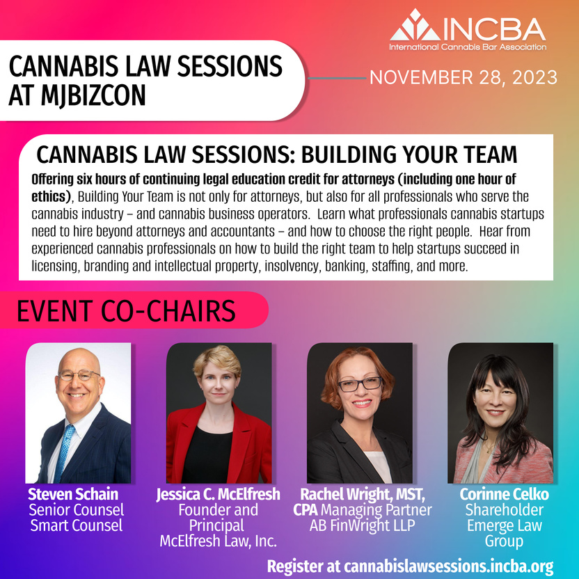 The International Cannabis Bar Association (INCBA) is excited to return to MJBizCon to present our annual set of continuing legal education sessions on Tuesday, November 28, 2023. Designed for attorneys and other professionals serving the cannabis industry such as accountants and consultants, but appropriate for sophisticated business owners and licensees and anyone else offering professional services to the cannabis industry, our legal sessions provide valuable insights for all, whether new to or versed in the cannabis industry or law practice.As the largest cannabis-focused B2B conference in the world, MJBizCon Las Vegas attracts over 25,000 attendees and over 150,000 industry professionals to city. Take advantage of this incredible business ecosystem and tap into the most knowledgeable community at the intersection of law and cannabis at INCBA's Cannabis Law Sessions.